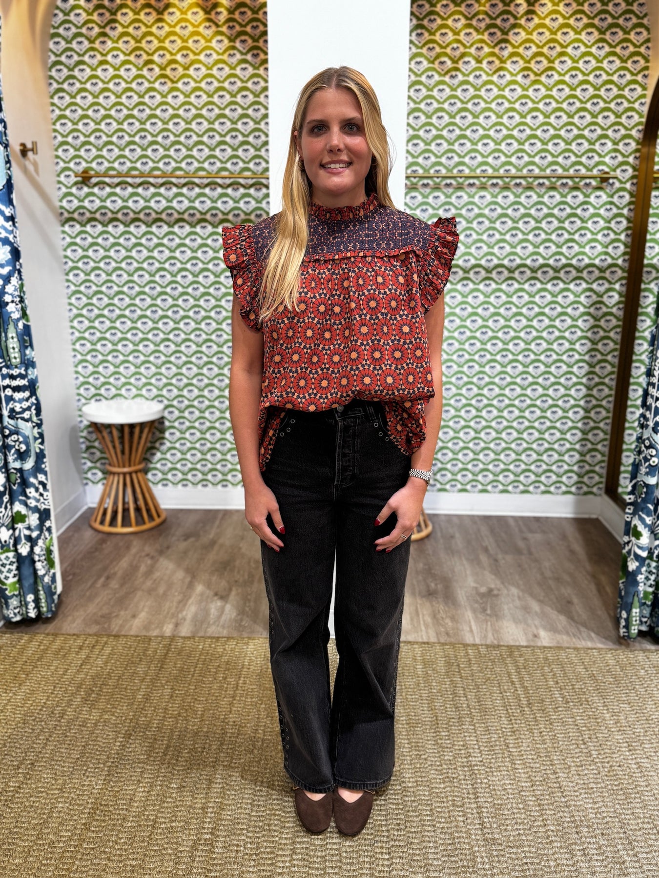 Brighten your wardrobe with the Bindu Karina Top, a playful blend of orange and navy floral patterns. This women's blouse adds a cheerful splash of color to any outfit, perfect for days when you want to stand out with effortless style. Its lively print and comfortable fit make it a go-to piece for both casual adventures and spirited gatherings.