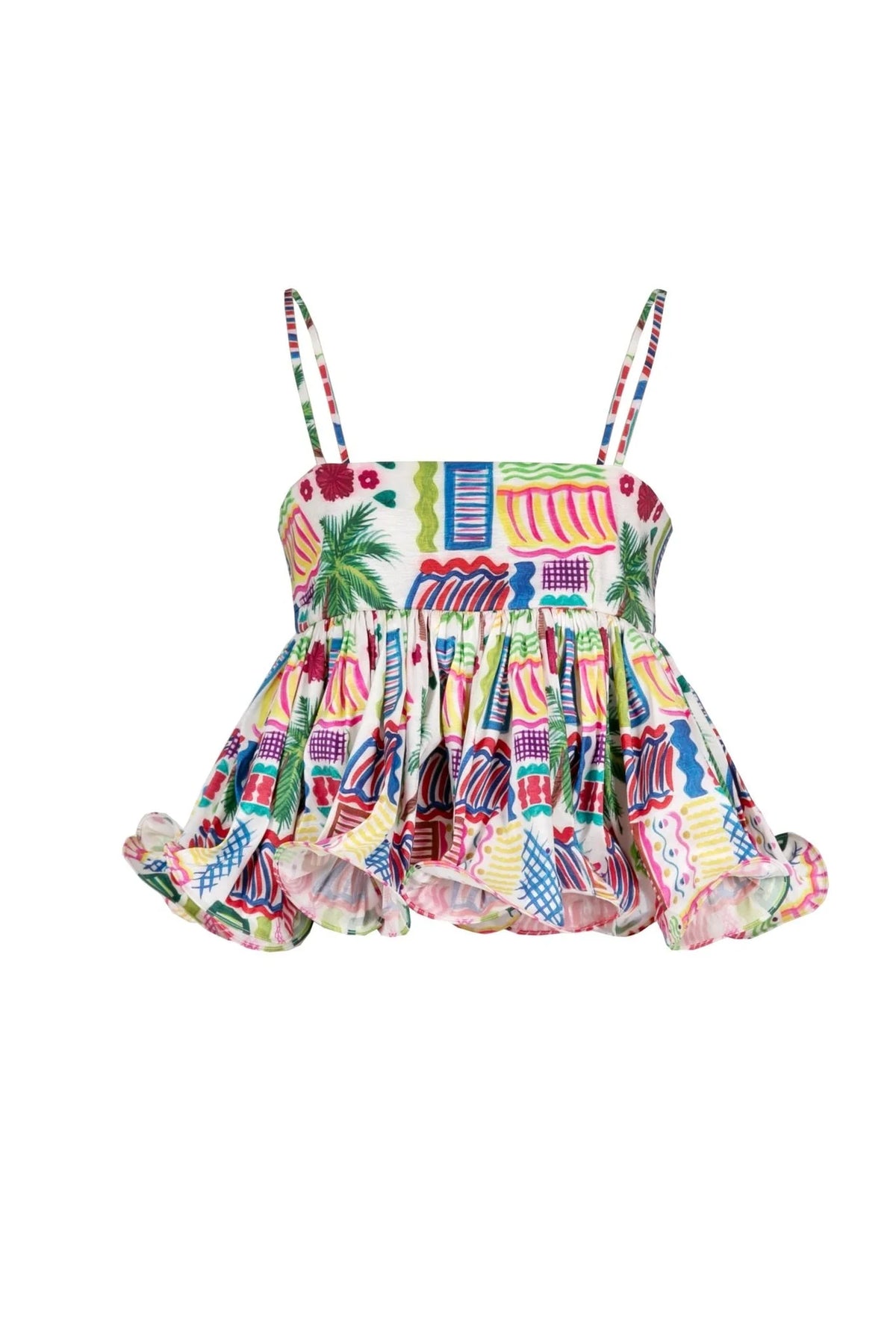 A playful top with straight structure at the chest and a voluminous body with ruffles that are structured at the edge to maintain their sculptural wave shape.