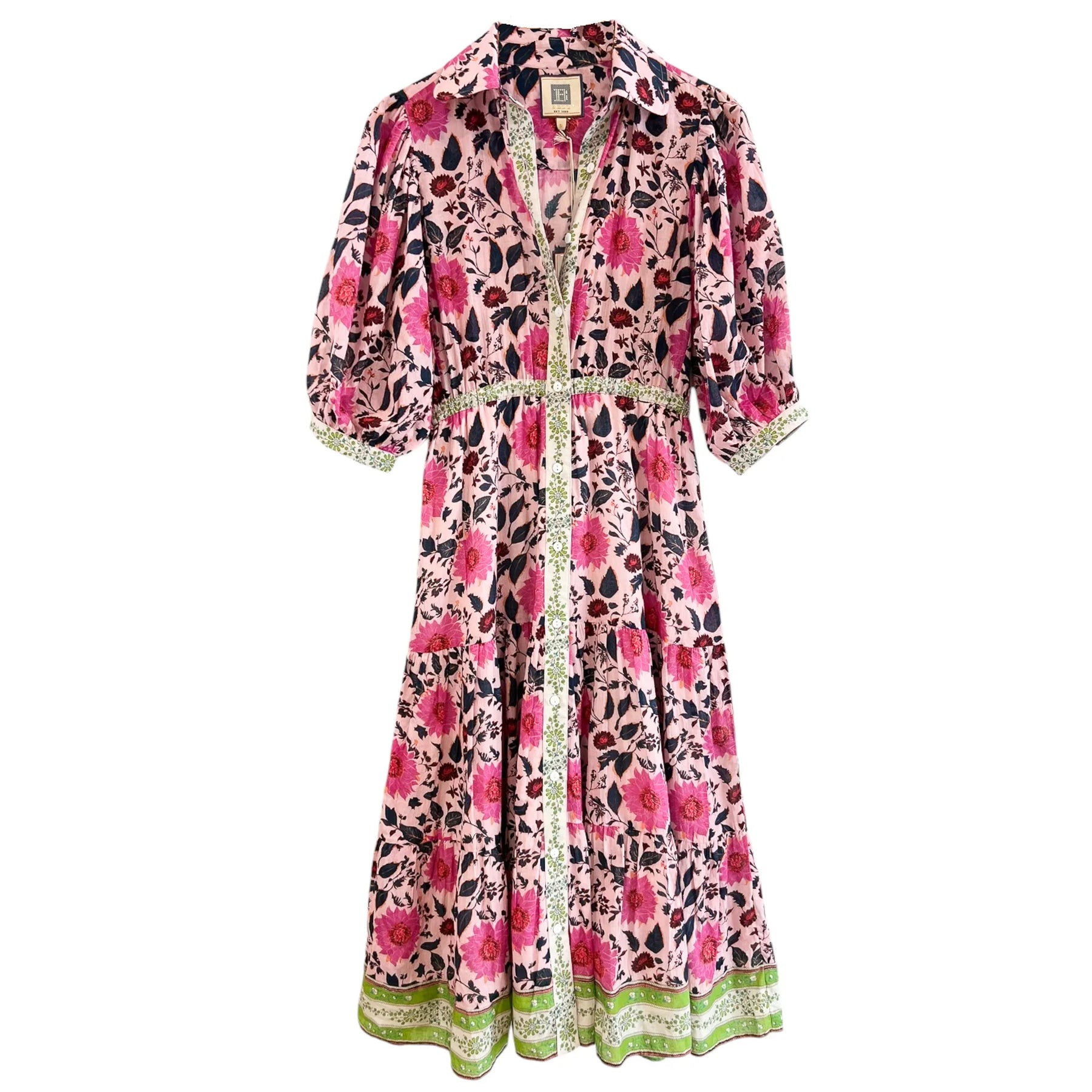 Silk cotton voile hand block collared midi dress with a 3/4 balloon sleeve