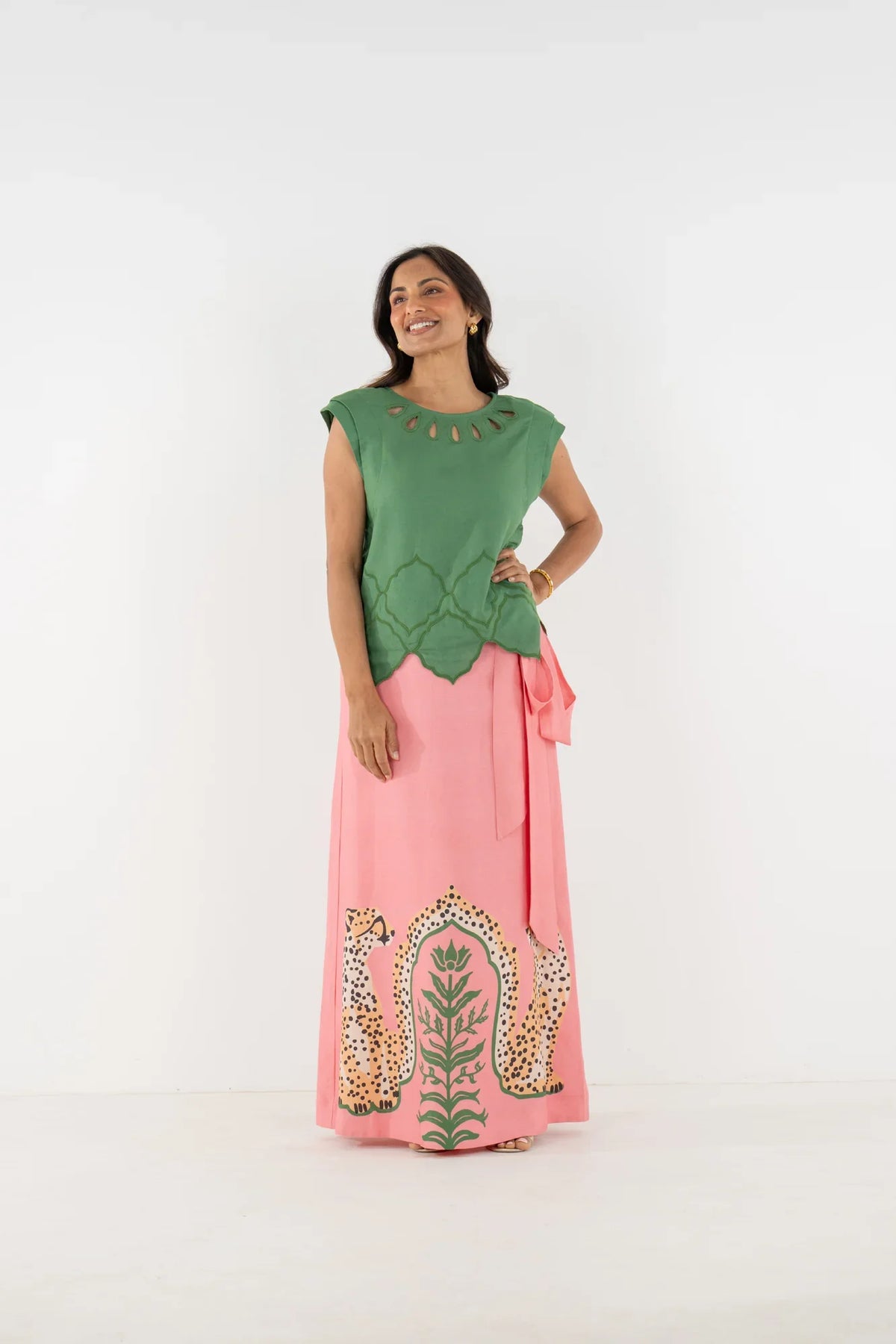 The Audrey Skirt in Cabana Cat is a statement in fluid playfulness. Designed with a high-waisted silhouette, it features a pre-tied, tacked bow at the waist and a clean side zip closure for a clean finish. The Cabana Cat motif introduces a sense of whimsical majesty, showcasing symmetrical regal cheetahs framing lush greenery for a look that feels both artful and elevated.