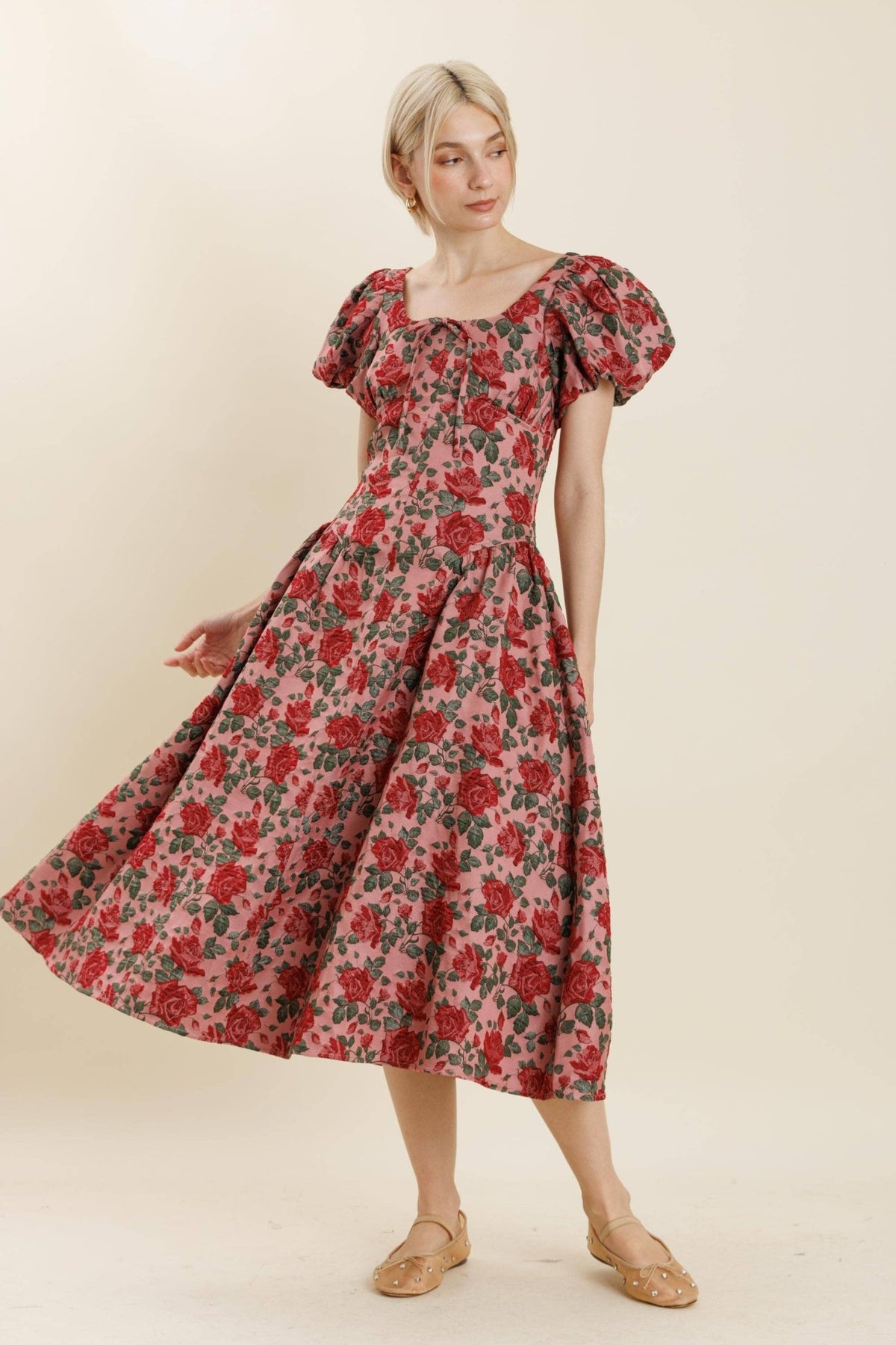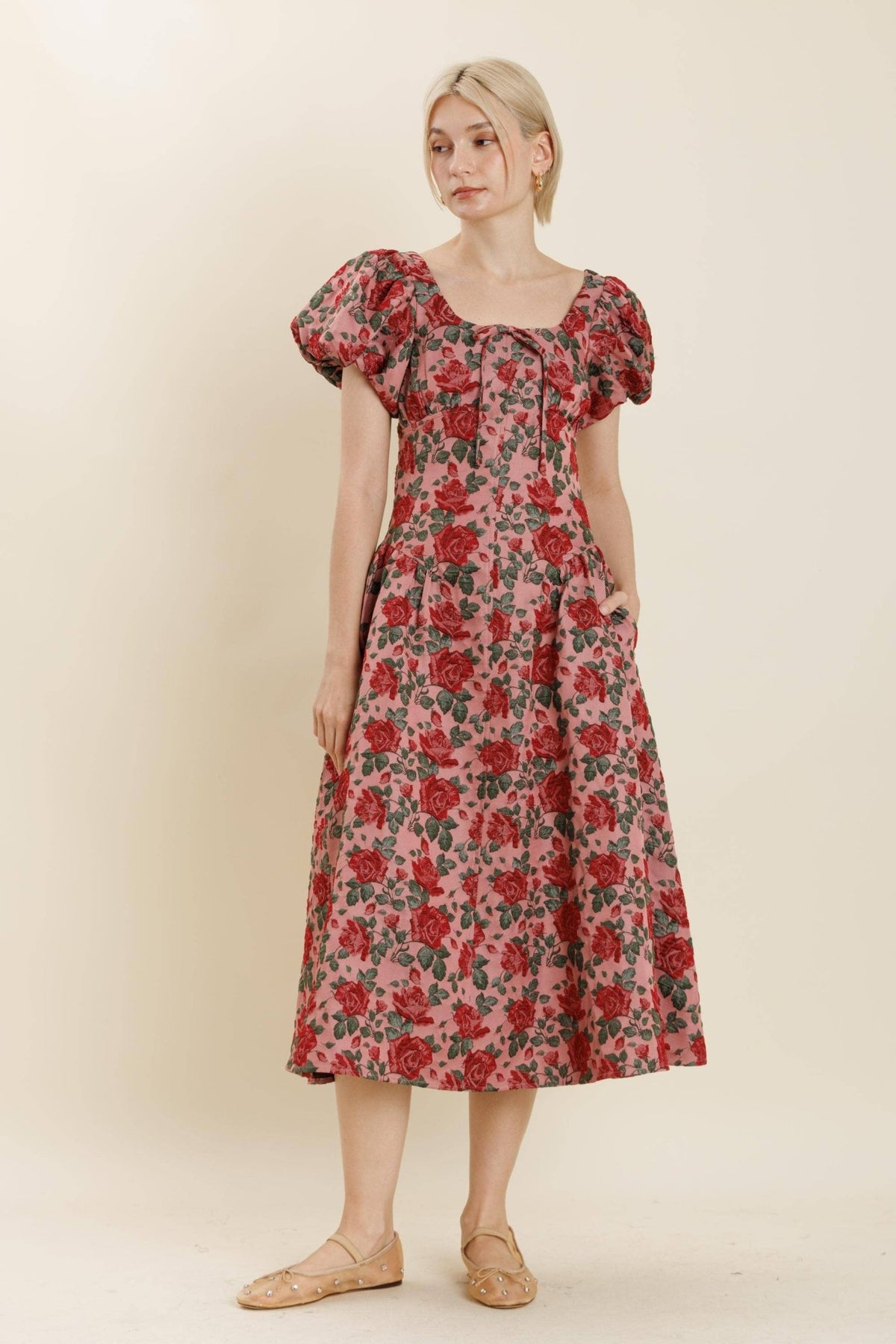 Introducing the Aureum Jacquard Midi Dress—where timeless elegance meets fun flair! This stunning piece features a non-stretch floral jacquard that makes a statement with every step. The charming square neckline with front tie adds a touch of whimsy, while the basque waistline with shirring creates a flattering silhouette that celebrates your curves. Perfect for brunch dates, garden parties, or whenever you want to feel effortlessly chic and playfully sophisticated.