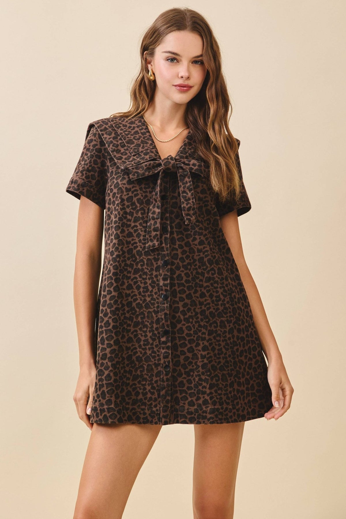 This mini dress features a bold leopard wash and an oversized sailor collar tied with a dramatic bow. Snap button front and short sleeves complete the effortlessly cool vibe.