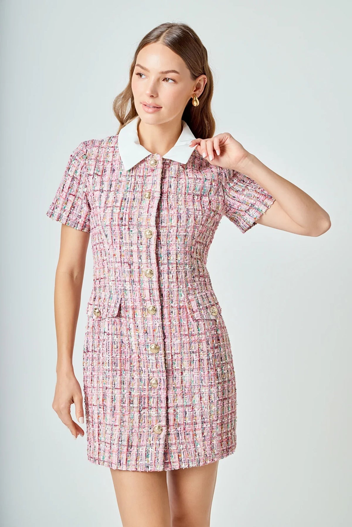 Discover your new favorite go-to dress with the Multi Tweed Collared Short Sleeve Dress. This mini dress features a regular fit, short sleeves, a collar, flap pockets, and gold buttons. Made with a tweed fabric, this dress is perfect for any fall or winter occasion. Whether you're going to a holiday party or a family gathering, you'll look your best in this stunning dress.