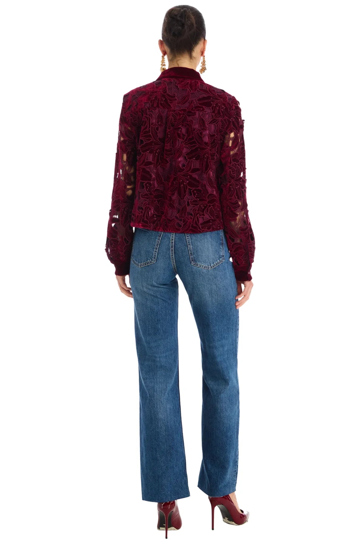 The Phoebe Shirt is designed in a luxe laser cut velvet fabrication in a slightly cropped and boxy shape. This classic shirt style has a collared neckline and center front buttons. The sleeves are unlined and end in a buttoned cuff. Features velvet at the the collar, center front and cuffs. Body is lined.