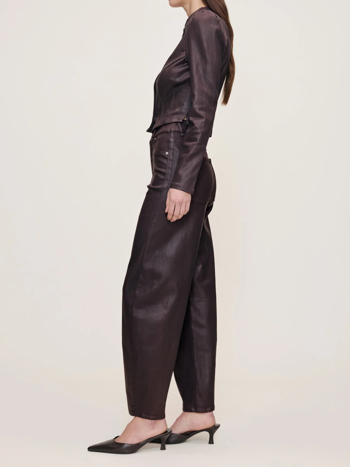 Miro is a high-rise, true barrel leg jean that is fitted at the hip with a 28" inseam, tapering at the leg.