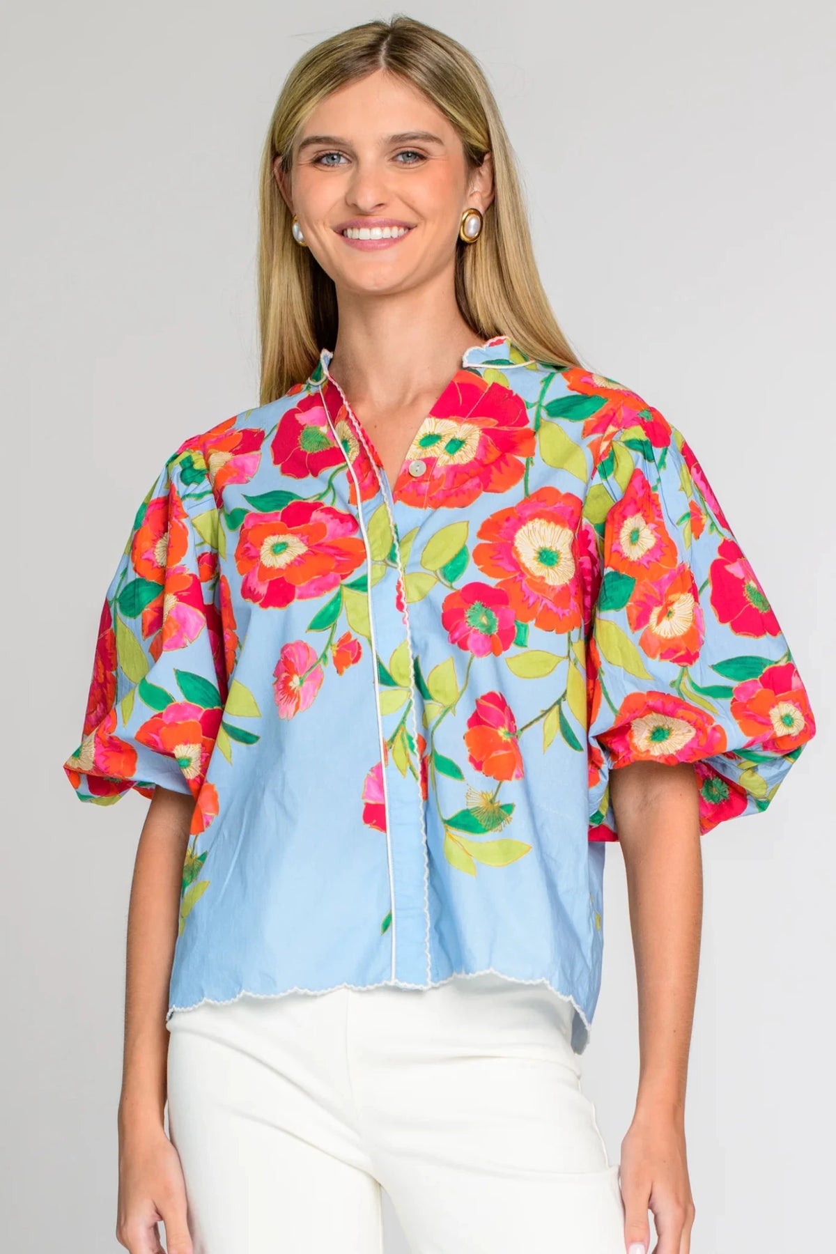 The button front Edie Top is one of our most adored styles and a basic that no wardrobe should be without. Featuring elastic cuff balloon sleeves and a covered placket, Edie looks great worn loose or tucked in with your favorite skirts, shorts or jeans.