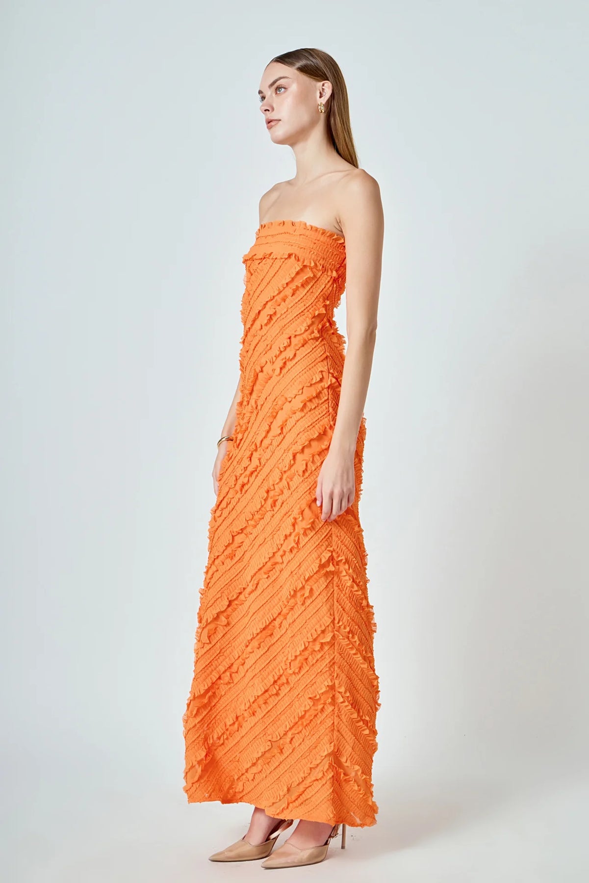 Introducing the Strapless Ruffled Maxi Dress, an effortless expression of grace and femininity. It is crafted from pleated chiffon and features delicate ruffles and a flowing maxi length. The bias cut flatters the figure with a soft, draped silhouette, while the strapless design adds a striking, modern edge. Ideal for weddings, summer soirees, or any special occasion, this dress promises to make a lasting impression.