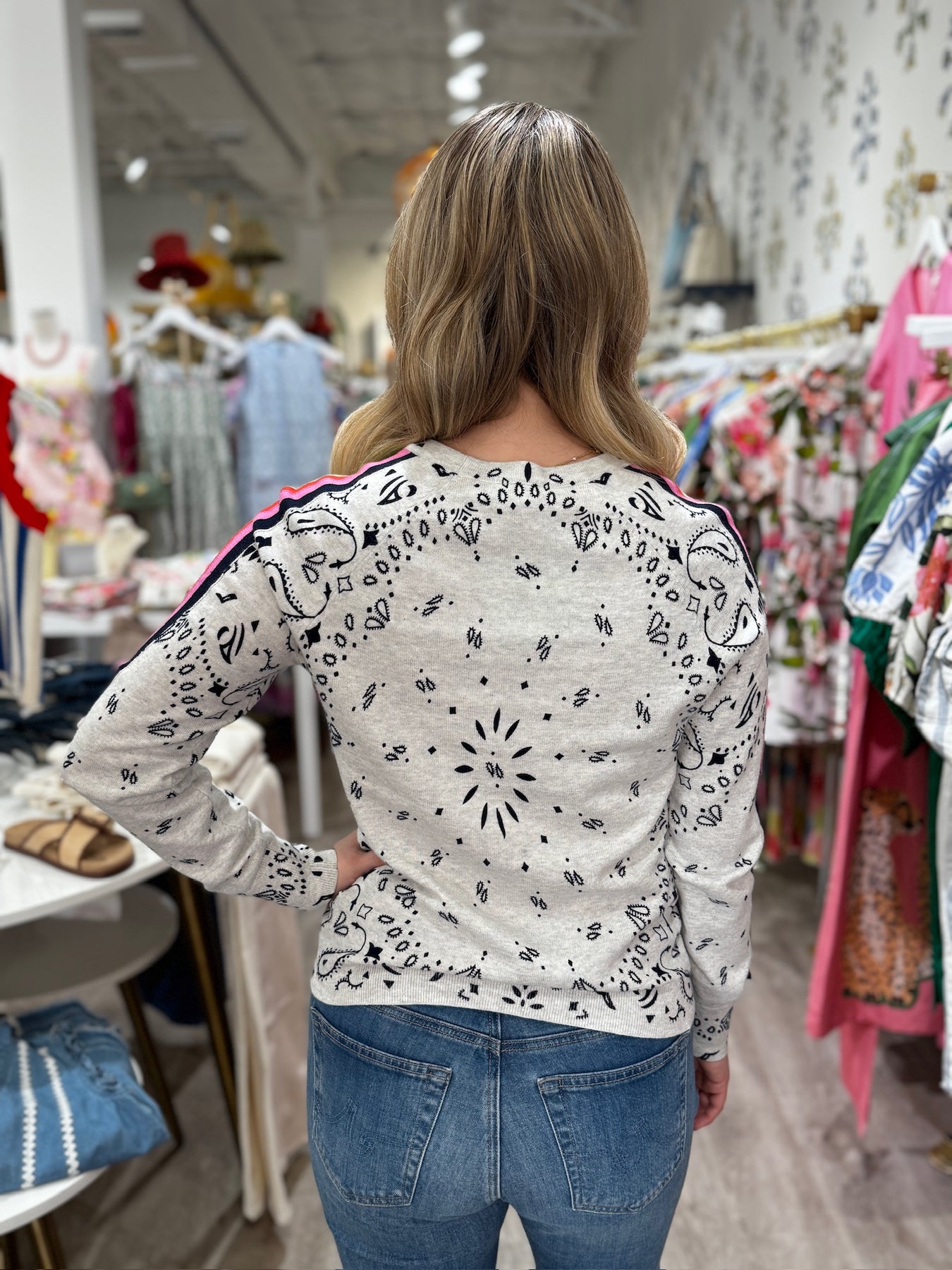 Wrap yourself in whimsy with this charming crew sweater featuring a bold bandana motif at the chest and vibrant rainbow-striped sleeves. Crafted from soft cotton, it's the perfect piece to add personality to your everyday wardrobe. Whether you're channeling retro vibes or just want to brighten your day, this playful pullover delivers comfort and style in one delightful package.