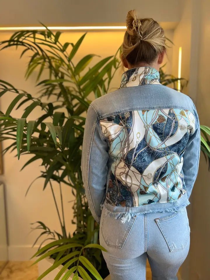 Feel effortlessly cool in Stacy Bradley's denim jacket. This jean jacket not only adds a touch of edge to any outfit, but also features a playful twist with its silk colorful backing. Embrace your fun and unique style with this must-have piece.