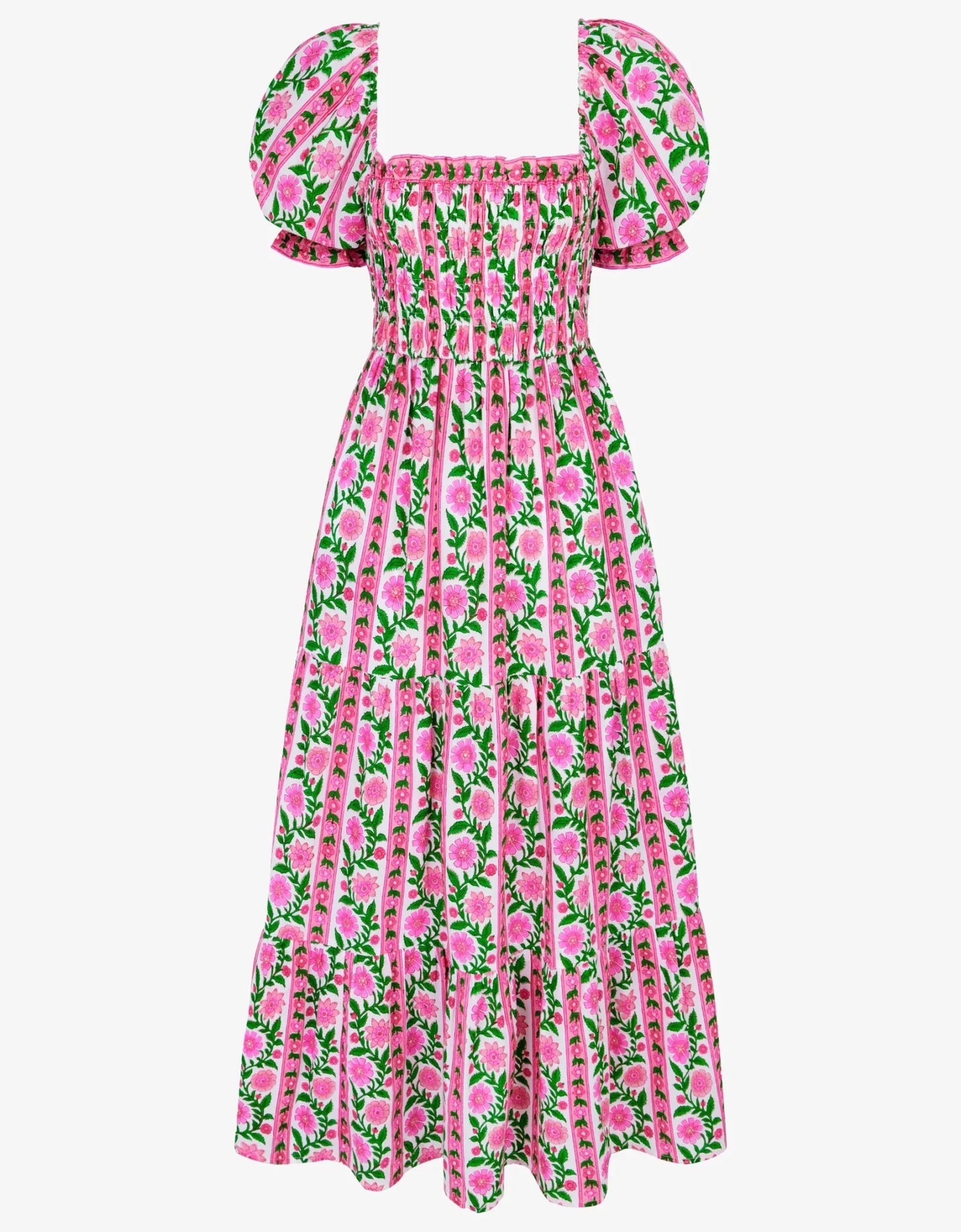 Our much-loved Palermo dress is a versatile wardrobe favourite perfect for holidays, weddings and everything in between. Block-printed by hand in our pretty Rose Border print, the Palermo dress features a comfortable, smocked body, contrasting border ruffle and a tiered skirt that’s perfect for dancing in. Pair with sneakers for everyday wear or dress up with heels and statement jewelry for special events.